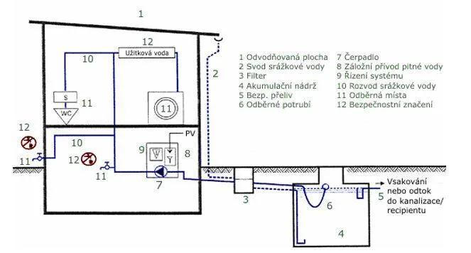 Typický systém pro užívání srážkové vody s akumulační nádrží umístěnou vně budovy je na obrázku.