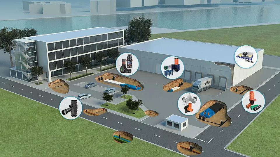 - Zasakování a retence - Akumulační boxy a vsakovací potrubí pro různé geologické podmínky, montážní případy a dopravní zatížení.