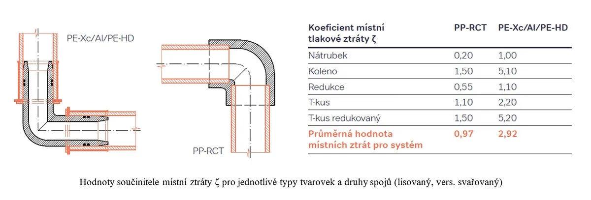 Přičemž celková tlaková ztráta v instalaci vlivem místních odporů následně odpovídá prostému součtu všech těchto dílčích hodnot, pro jednotlivé dílčí tvarovky vyskytující se v instalaci. Z uvedeného vztahu je zřejmé, že pro místní tlakové ztráty je rozhodující tvar tvarovky (její hydraulická hladkost, resp. složitost), na kterém je závislá konkrétní hodnota ztrátového součinitele ζ a dale pak rychlost proudícího media. Porovnání tvaru tvarovky a rámcové hodnoty ztrátového součinitele pro svařované systémy PP-RCT a lisované systémy Tigris jsou uvedeny na následujícím obrázku, resp. v následující tabulce