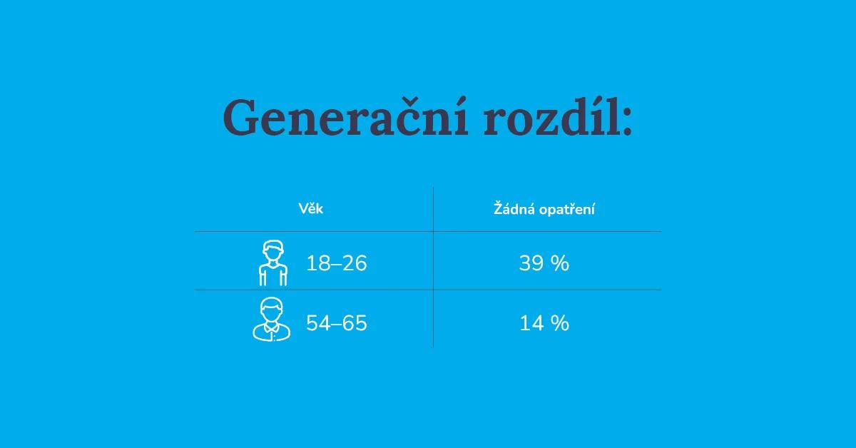 Zatímco mezi mladými ve věku 18–26 let nepoužívá žádné úsporné opatření 39 % respondentů, ve skupině 54–65 let je to pouze 14 %. Podobný trend je patrný i u vzdělání — čím vyšší vzdělání, tím menší je podíl domácností bez jakýchkoli opatření.