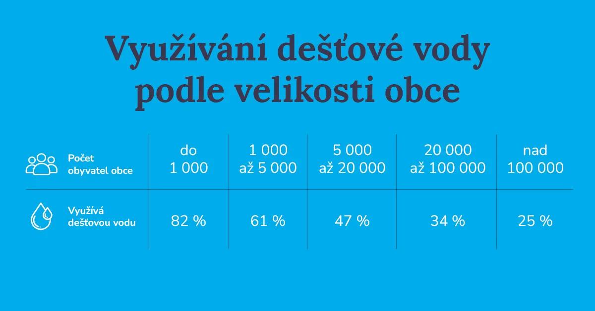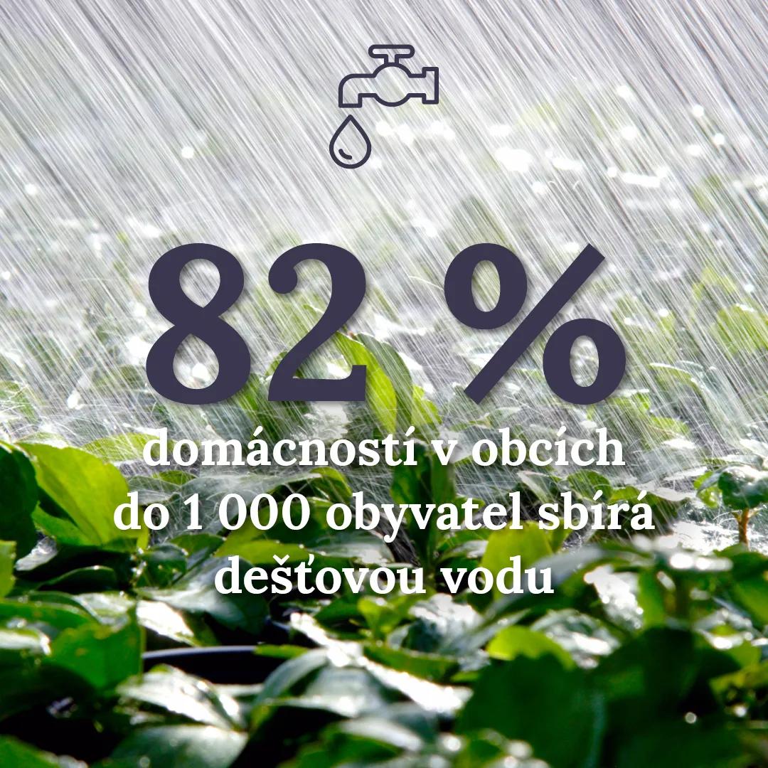Téměř polovina domácností (48 %) sbírá dešťovou vodu, rozdíly mezi jednotlivými místy jsou ale výrazné. V obcích do 1 000 obyvatel ji využívá 82 % domácností, zatímco ve městech nad 100 tisíc obyvatel jen 25 %. S rostoucí velikostí místa tak ochota zachytávat dešťovou vodu klesá. Regionálně vede Olomoucký kraj se 70 % domácností, které dešťovku sbírají, na opačném konci stojí Praha s pouhými 23 %.