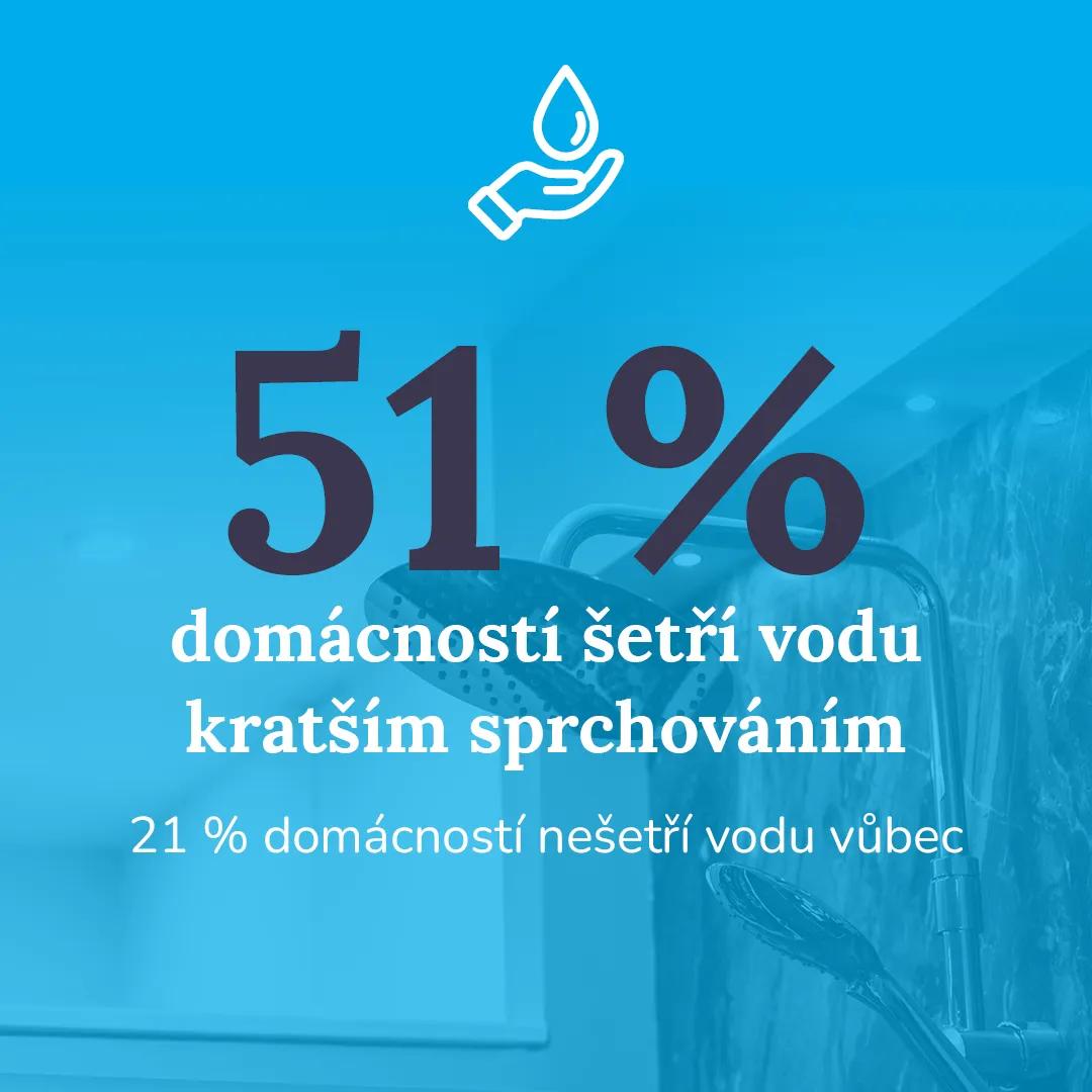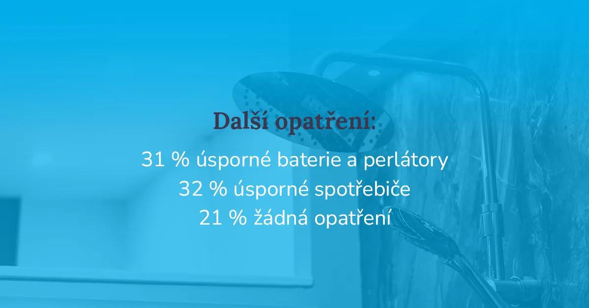 Češi se sice snaží vodou neplýtvat, většinou ale volí rychlá a nenáročná řešení. Nejčastějším opatřením je kratší sprchování, které uvádí 51 % domácností. Následují úsporné spotřebiče (32 %) a úsporné baterie či perlátory (31 %). Přesto více než pětina domácností (21 %) nepoužívá žádná opatření na úsporu vody.