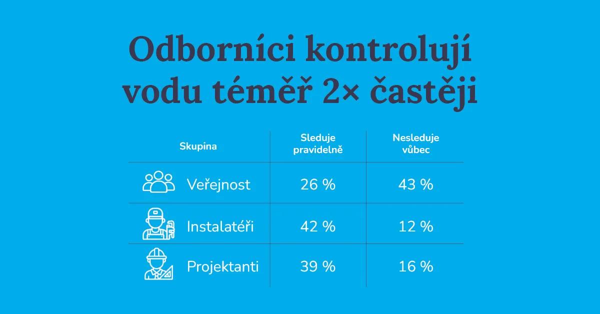 Mezi instalatéry sleduje spotřebu pravidelně 42 % a jen 12 % ji nesleduje vůbec, u projektantů je to 39 % pravidelně a 16 % vůbec. Nejde přitom o jejich profesní deformaci, ale pravděpodobně o hlubší povědomí o ceně vody a riziku úniků.