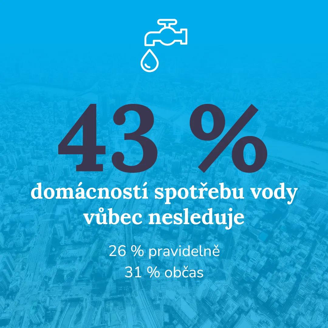 Téměř polovina českých domácností (43 %) svou spotřebu vody vůbec nesleduje. Pravidelně ji kontroluje pouze 26 % a dalších 31 % jen občas. Výrazné rozdíly se přitom ukazují mezi velkými městy a menšími obcemi: v malých obcích do 1 000 obyvatel sleduje spotřebu pravidelně 39 % domácností, zatímco ve velkých městech nad 100 tisíc obyvatel jen 20 %. Ve velkých městech dokonce více než polovina lidí (52,3 %) spotřebu nesleduje vůbec. Data tak ukazují, že čím anonymnější je infrastruktura, tím menší je kontrola.