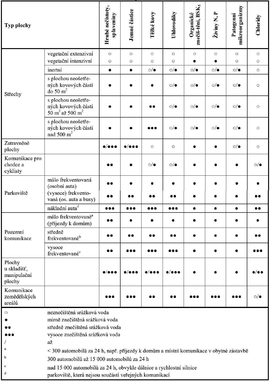 Tabulka: Typické znečišťující látky na jednotlivých typech ploch a očekávané znečištění srážkového odtoku (TNV 75 9011)