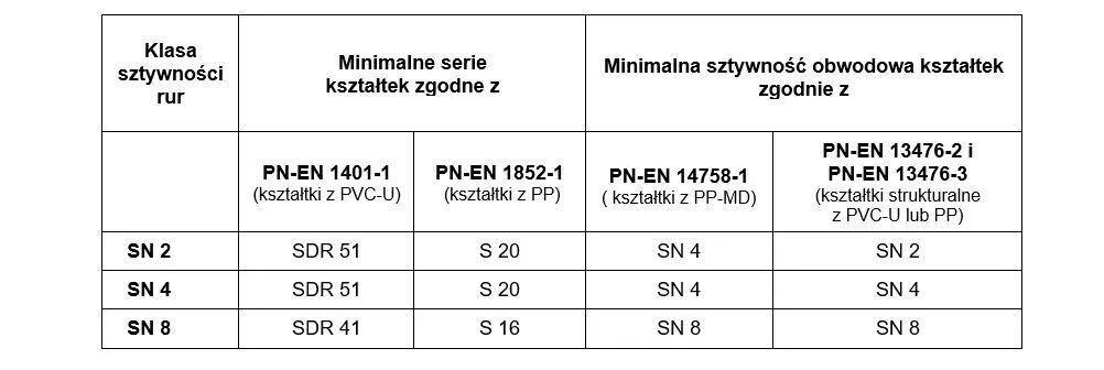 Mając na uwadze powyższe doświadczenia w Warunkach technicznych wykonania i odbioru systemów z termoplastycznych tworzyw sztucznych PVC-U, PE i PP (PN-C-89224) zawarto zalecenia wskazujące powiązanie sztywności rur i kształtek, co pokazuje poniższy wyciąg z normatywnej Tablicy.