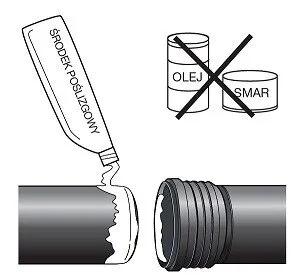 Standardowe uszczelki stosowane w systemach kanalizacyjnych wykonane są z SBR (kauczuk butadienowo-styrenowy), który ulega degradacji pod wpływem kontaktu ze smarami i olejami mineralnymi. Czasami warto również posmarować samą uszczelkę dedykowanym środkiem poślizgowym, jeśli ilość fabrycznego smaru jest niewystarczająca do pokonania pierwszego oporu podczas wcisku. Z drugiej strony z ilością środka poślizgowego na uszczelce nie należy przesadzać. Szczególnie mowa tu o przedostawaniu się smaru między uszczelkę a rowek kielicha. Napotkawszy pierwszy opór uszczelka, może się w takim przypadku wyślizgnąć z rowka i podwinąć. Dlatego, jeśli to możliwe, po wykonaniu połączenia warto zajrzeć do środka, jeśli użycie sporej ilości środka smarnego nie przełożyło się na użycie mniejszej siły wcisku.