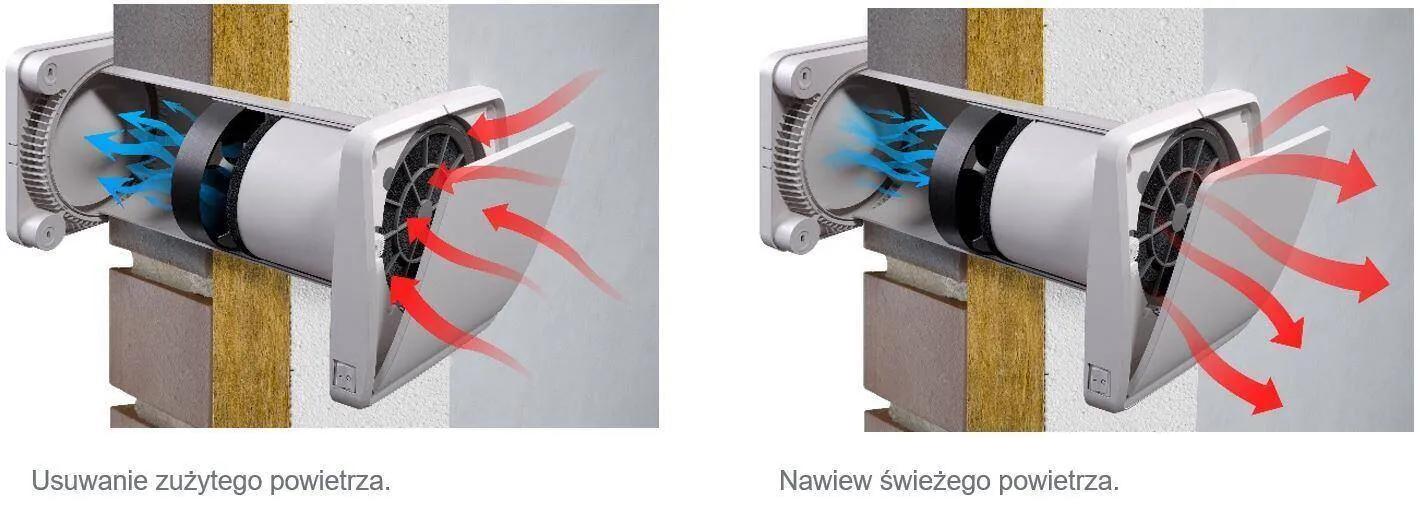 - po zakończeniu pierwszego etapu wentylator zmienia kierunek obrotów i rozpoczyna się tryb nawiewu, który również trwa 70 sekund – świeże powietrze z zewnątrz przepływa przez filtry i wymiennik ciepła, gdzie jest ogrzewane, a następnie nawiewane do pomieszczenia.